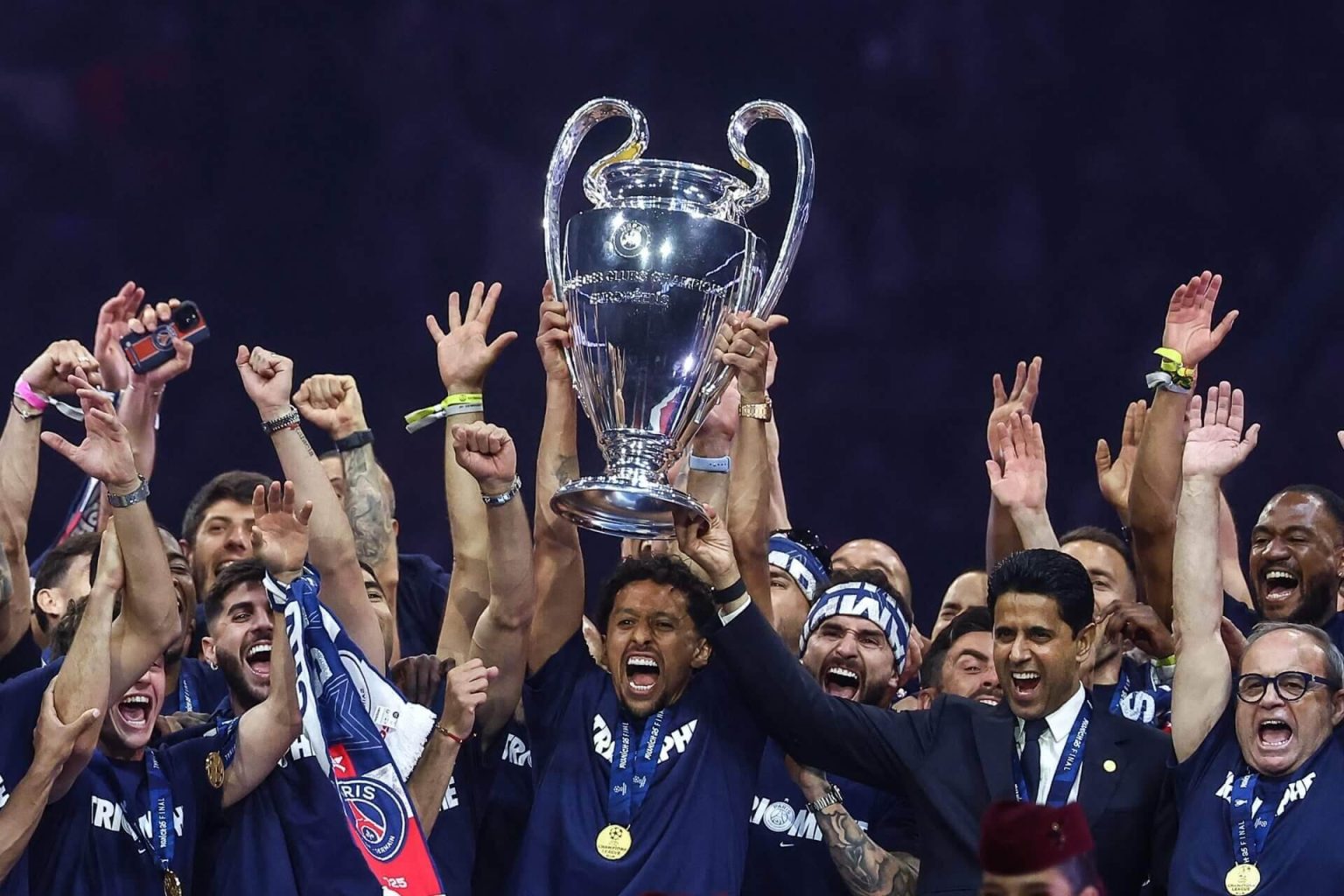 Kapiteni i Paris Saint-Germain, Marquinhos, ngriti trofeun e Ligës së Kampionëve pas fitores 5-0 ndaj Interit sezonin e kaluar.