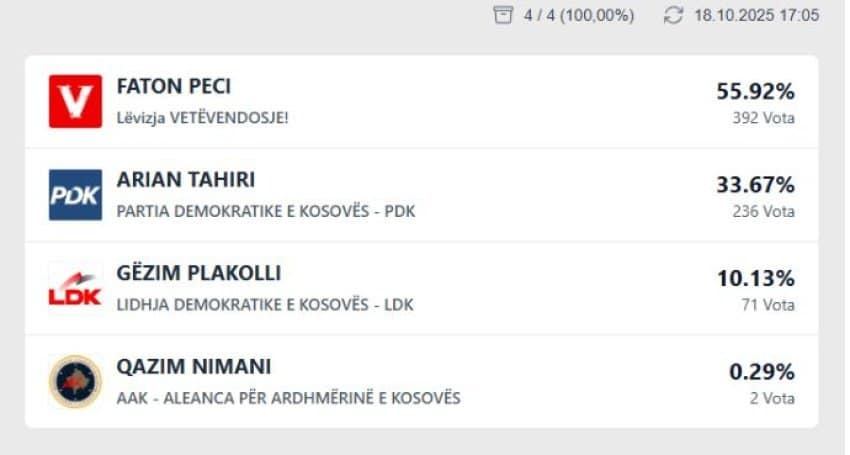 Sipas rezultateve, Faton Peci nga VV kryeson me 392 vota, që përbëjnë 55.92 për qind. Pas tij vjen Arian Tahiri i PDK-së me 236 vota, ose 33.67 për qind. Në vendin e tretë është Gëzim Plakolli i Lidhjes Demokratike të Kosovës me 71 vota të ardhura nga diaspora.
